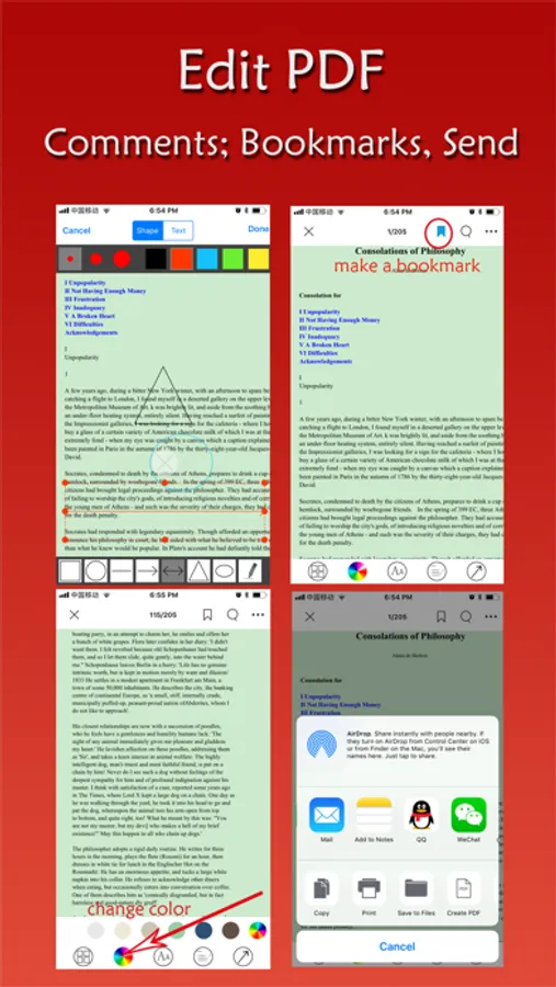 PDF reading: change text color, modify text size, browse PDF, bookmark, send document;
