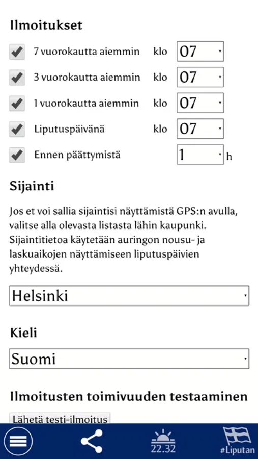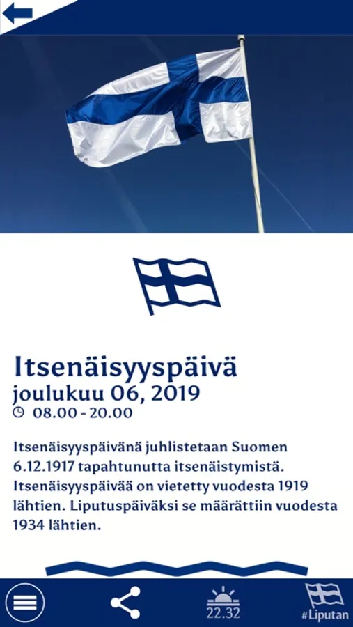 There are some rules in Finnish flag flying culture, but in principle flying the flag is a joyful and dignified way of honouring Finnishness. The app is part of the #Liputan campaign of the Ministry of the Interior.