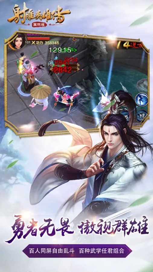 《射雕英雄传-国际版》拥有专业的武学体系,在这里,玩家可以自由研习数十种金庸小说中经典的武学秘籍。游戏中,武学包含了外功招式、内功心法两种修炼模式。十余种外功、内功组合下,玩家将可以自由组合超出100中套路组合。