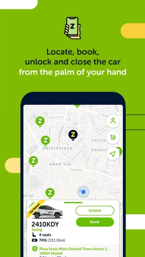 Reserve it, open it and close it from the mobile, without keys, without complications. Report the possible existing damages from the app. Free driving, park for free in regulated parking zones and enjoy of higher range.