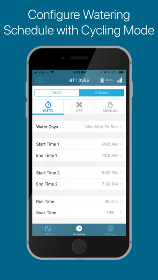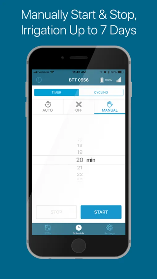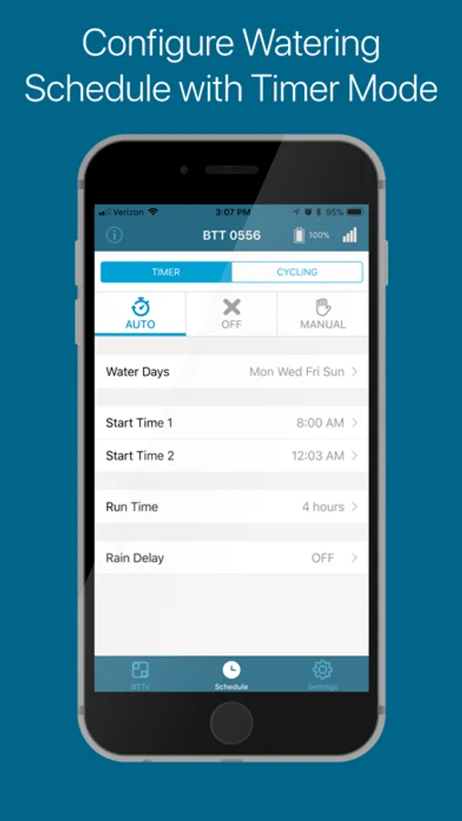 BTT is easy to operate and simple to set up. It provides you with several convenient options to remotely program irrigation wirelessly from a smartphone. This means no more climbing around shrubs, stepping on delicate plants, or going outside to turn on the water.