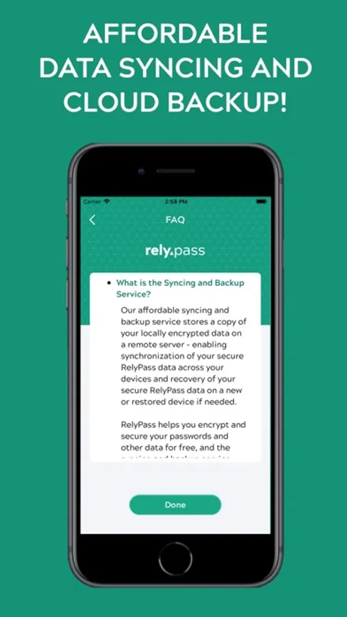 RelyPass is FREE TO USE on your device, as long as you agree to our terms of use and privacy policy. We also offer affordable Cloud Syncing and Backup Services that allow you to synchronize your secure data across your supported devices and be able to recover your secure data in case your device is lost or unavailable. Our Syncing and Backup services are available as IN-APP-PURCHASES and we offer affordable Annual plans for both individuals and families.