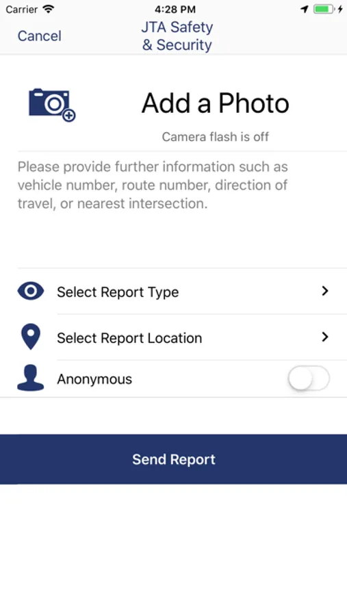 * The “Report an Issue” button allows users to send text or photos directly to the police. To ensure discretion, the camera flash is automatically disabled when photos are taken through the app. When reporting an issue, users can select locations and report categories to assist the police. Riders can also send reports anonymously if they chose.