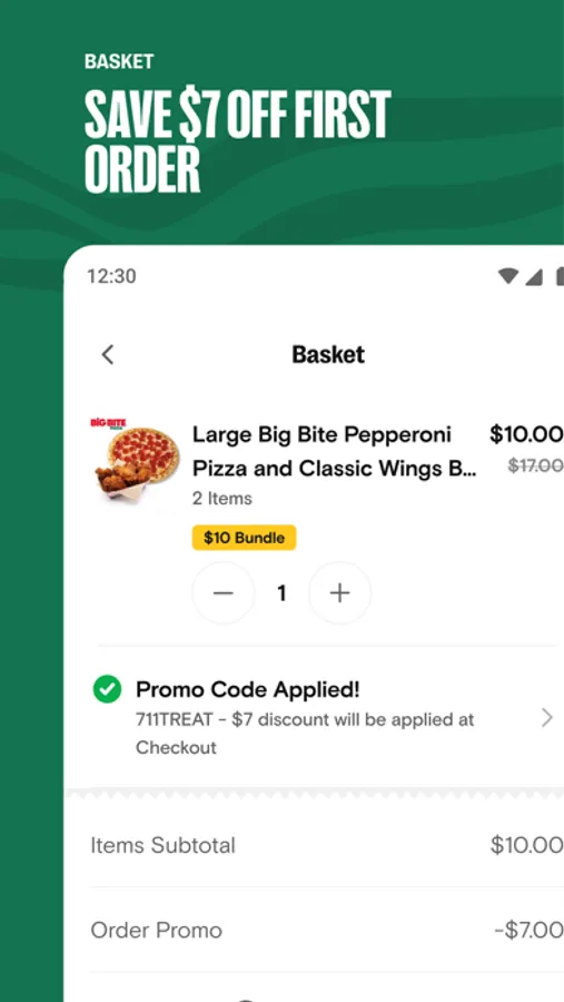 Get a $7 off on your first delivery purchase made through the 7NOW App with minimum purchase of $7. Consumer pays all applicable sales taxes and fees. $1.99 small basket fee may apply if $15 minimum purchase requirement is not met. Cannot be combined with any other offer or discount. No cash value. Non-transferable. Limited delivery area. Void where prohibited. 7-Eleven, Inc. reserves the right to modify, change or cancel this offer at any time.