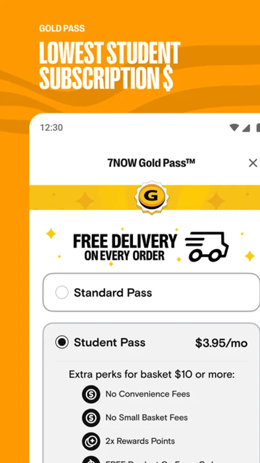 A monthly subscription program that offers customers, unlimited free deliveries on a choice of more than 3000 of their favorite 7-Eleven products. Discounted pricing for students also available. Plus, on orders over $10, you can get free products, 2X Reward points, and more. A complimentary 30-day trial is offered to all new subscribers.