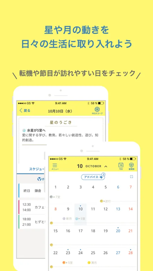 星占いで使う10個の星の動きや、新月・満月の日、ボイドタイムなどの情報が、あらかじめカレンダーに表示されています。スケジュールを決めるとき、何だか調子が出ないとき、星の影響をチェックしてみましょう。