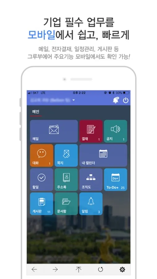 모바일에서 사용가능한 그룹웨어 기능은 메일, 전자결재, 대화, 쪽지, 주소록, To-Do+, 문서함 등 입니다.