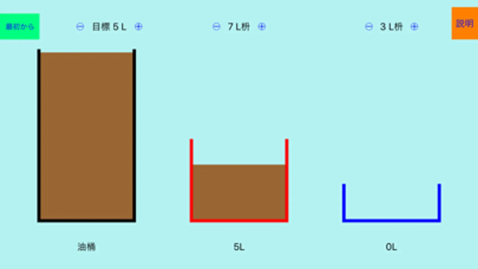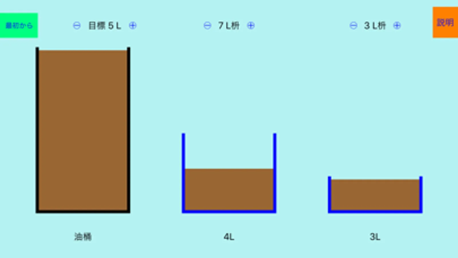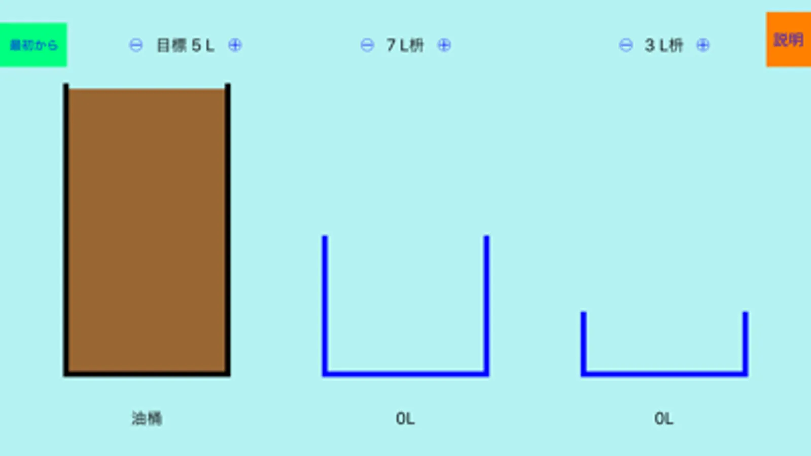 初期設定では「7Lの枡と3Lの枡で5Lを量る」問題です。