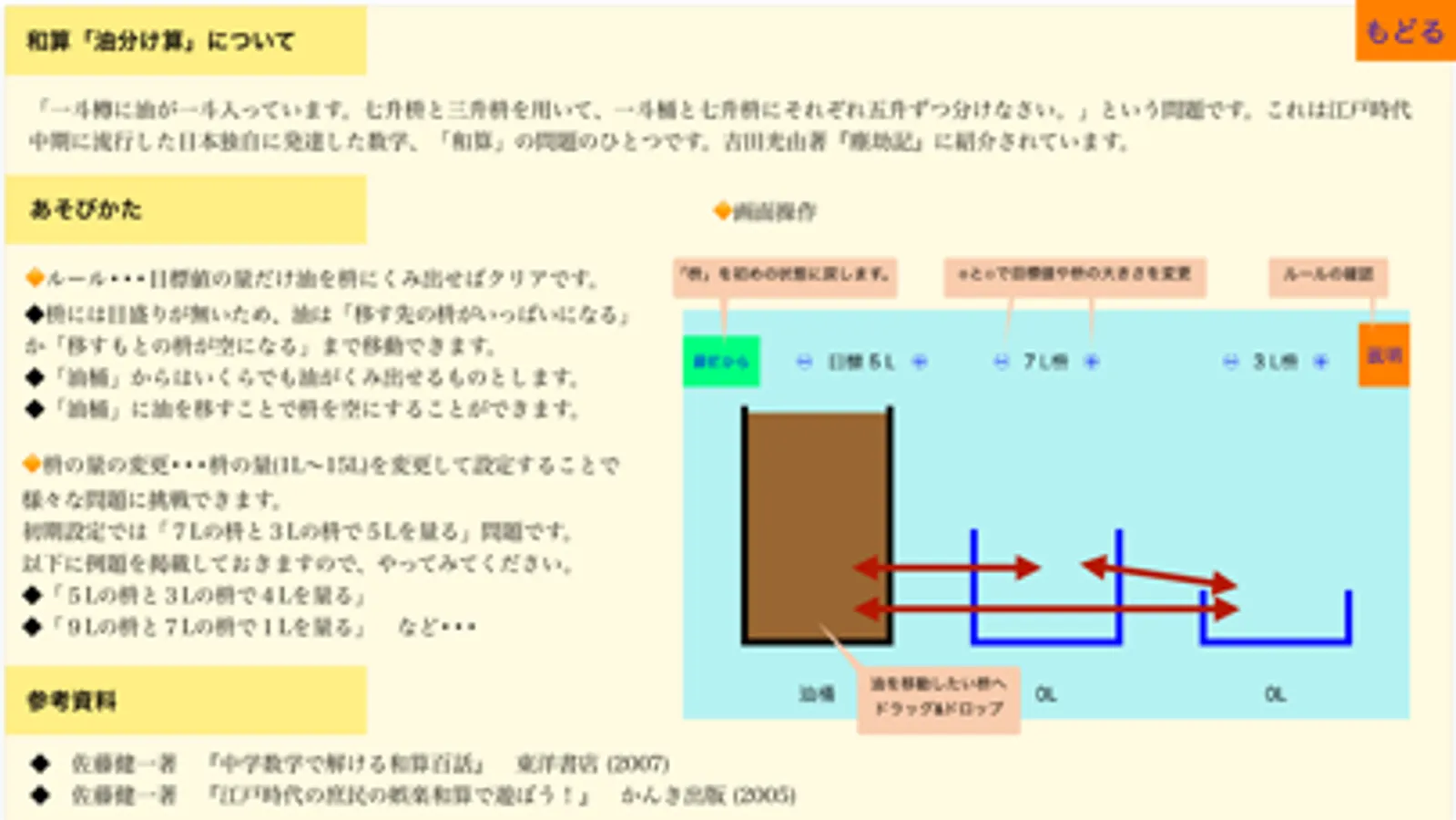 「油分け算」は「一斗樽に油が一斗入っています。七升枡と三升枡を用いて、一斗桶と七升枡にそれぞれ五升ずつ分けなさい」という問題です。