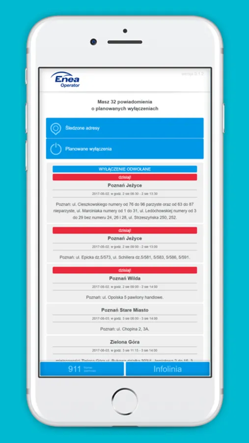 Aplikacja dostarcza informacji o awariach i planowanych wyłączeniach w sieci Enea Operator zgodnie z adresami zdefiniowanymi przez użytkownika.