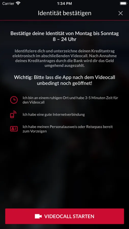 Mit der App kannst du rund um die Uhr einen Kredit beantragen. Für den Abschluss ist nur ein kurzer Video-Call notwendig, dieser steht für dich jeden Tag von 8 bis 24 Uhr bereit.