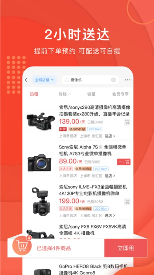 同城用户下订单选择同城闪送,两小时内即可拿到所租赁商品,租赁更方便!
