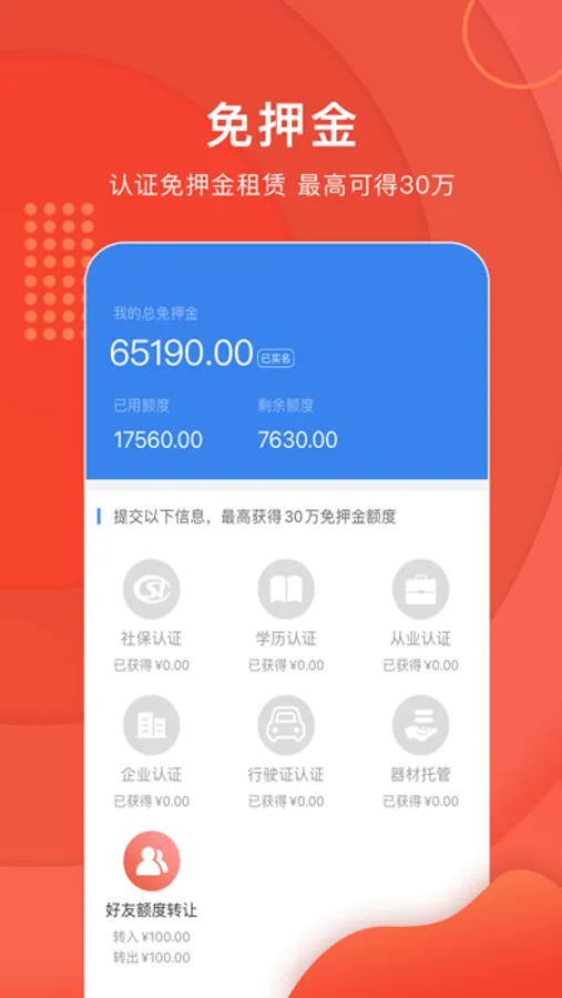 与芝麻信用达成合作,通过芝麻信用分可获得押金减免服务,认证更多个人信息可获得更高免押金额度,根据分值最高可全部减免。