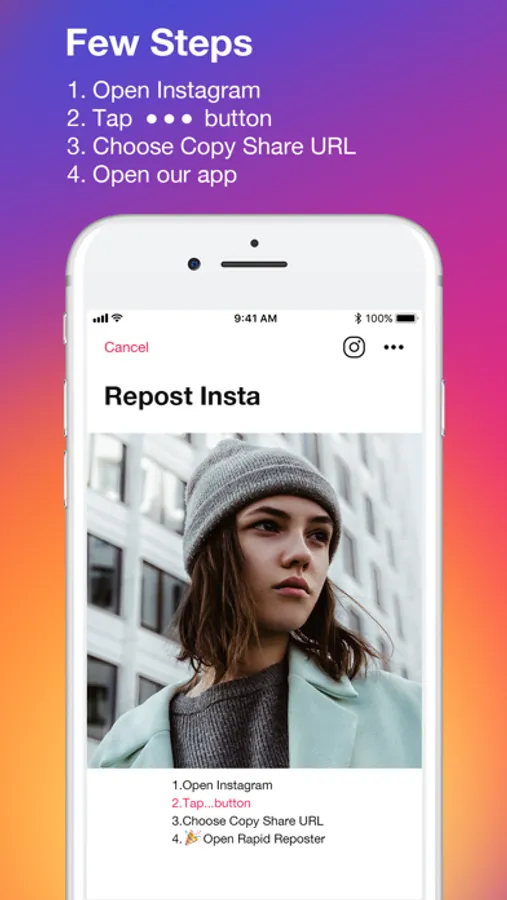 2. Copy the share URL and open Repost Photos for Instagram app.