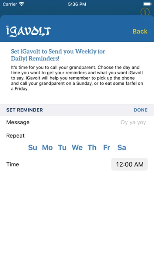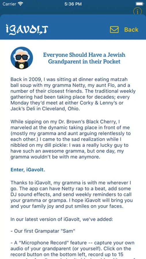 Thanks to iGavolt, my gramma is with me wherever I go. The app can have Netty rap to a hip hop beat, add some DJ sound effects, and send weekly reminders to call your gramma or grampa. I hope iGavolt will bring you and your family joy and put smiles on your faces.