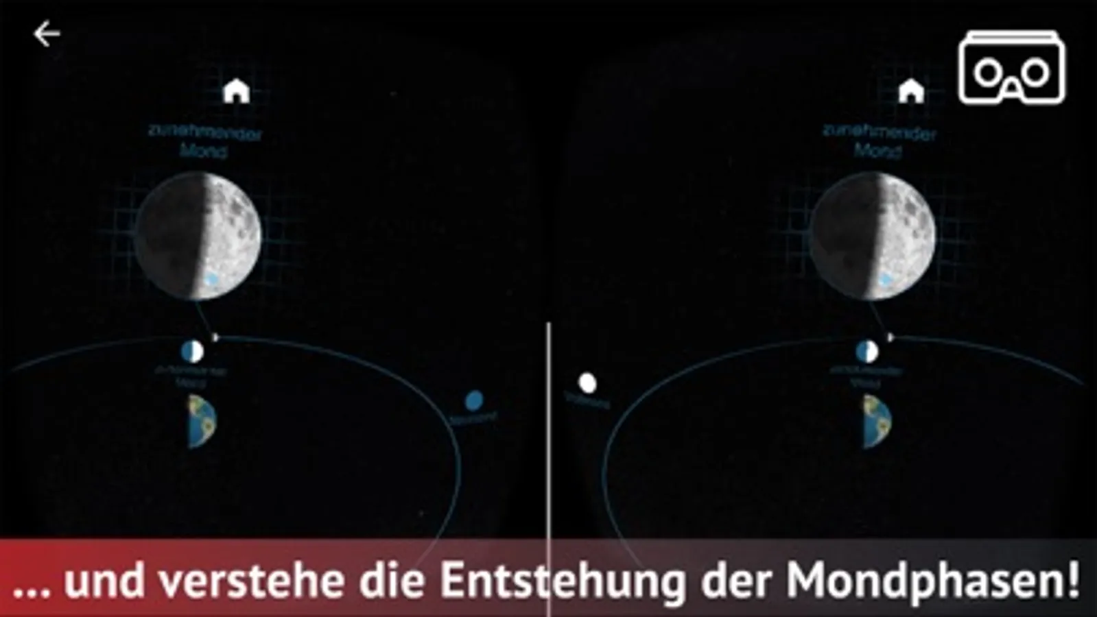 Das Weltall steckt voller spannender Informationen. Mit dieser Virtual-Reality-App erkundest du atemberaubende 360°-Ansichten und schaust dir Planeten und Sterne aus nächster Nähe in 3-D an. Schau nach oben, nach unten oder hin und her – wohin du dich auch drehst, überall gibt es etwas zu entdecken!