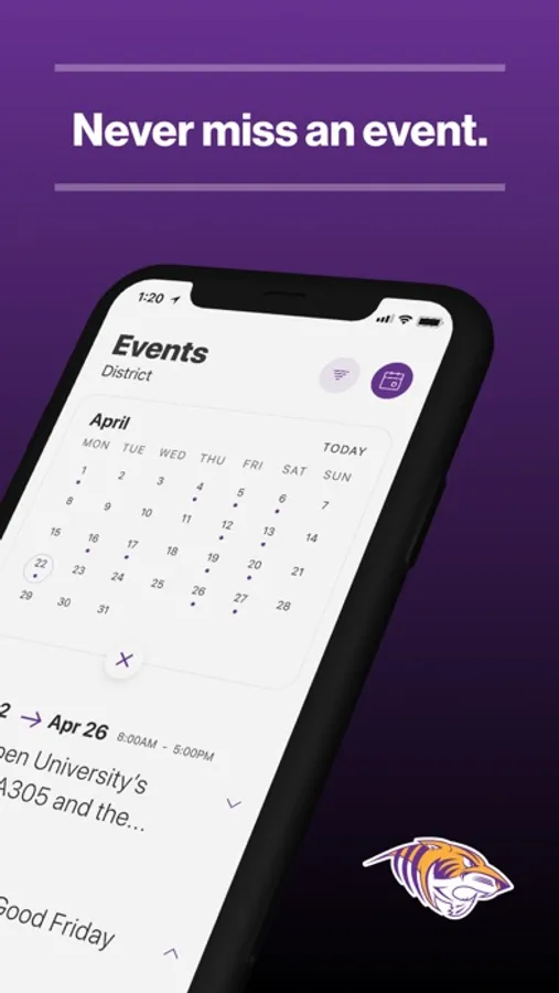 The event section shows a list of events throughout the district. Users can add an event to your calendar to share the event with friends and family with one tap.