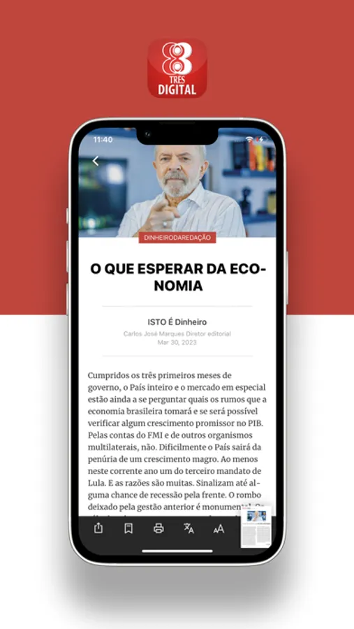 No aplicativo Três Digital , você vai encontrar todas as revistas da Editora Três. São 12 revistas com temas variados entre universo feminino, economia e negócios, política e atualidades, carros, corrida, saúde e qualidade de vida, cultura contemporânea, gastronomia, viagens de aventura, sustentabilidade e comportamento, com as seções, as entrevistas e as reportagens que transformaram a Editora Três numa das maiores editoras em referência no jornalismo brasileiro, com a praticidade de acessar pelo seu smartphone e/ou iPad.