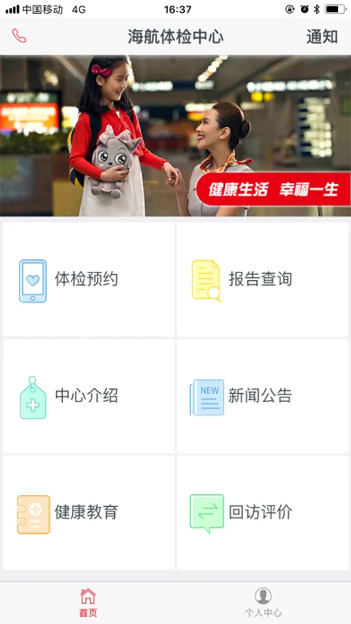 为海航体检中心受检者提供移动端应用体验,主要功能包括体检预约、报告查询、消息通知、回访评价、中心介绍、新闻公告、健康教育及个人中心。