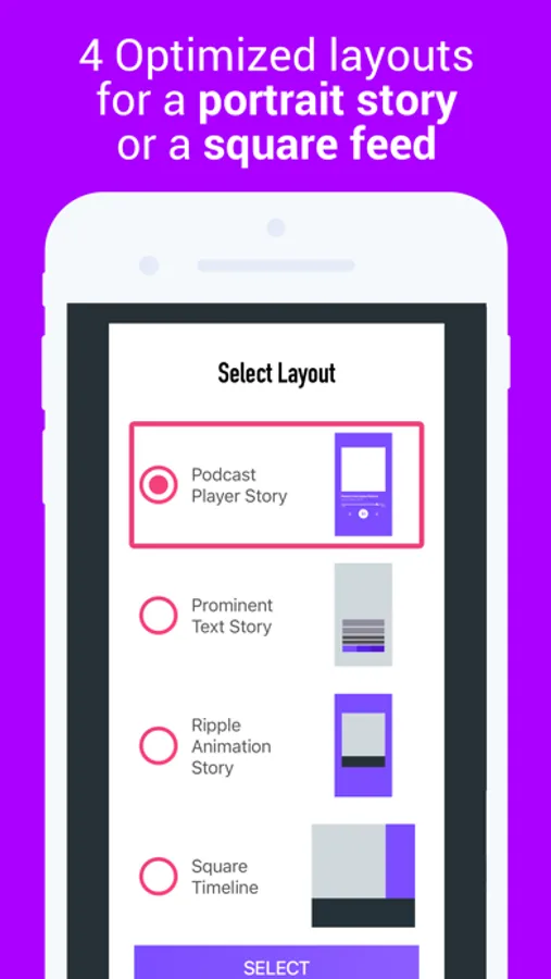 - Features two animated layouts: square for Instagram timeline, or portrait for stories.