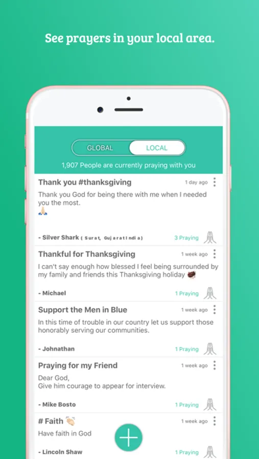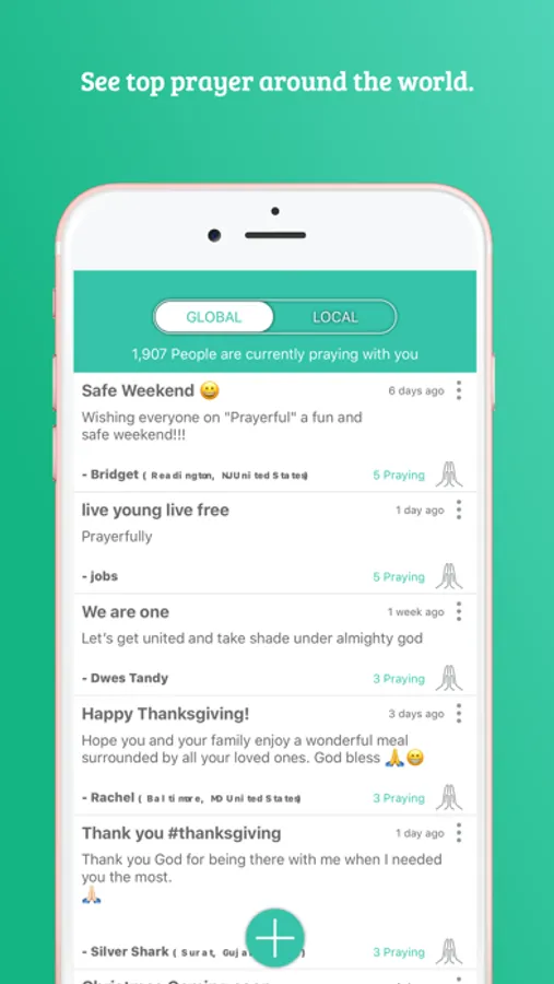 Join our prayer community to share your prayers with God, your church, and Christians from around the world. Connect with a community of believers praying around the world RIGHT NOW! Post your own prayer and receive positive support from our community in seconds. See the top players around the world by clicking "Global” or if you are just looking to connect with your community hit, "Local" and find others praying right in your city. See the total # of people praying around the world right now in real-time!