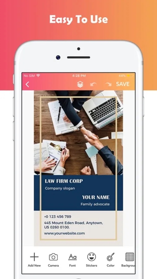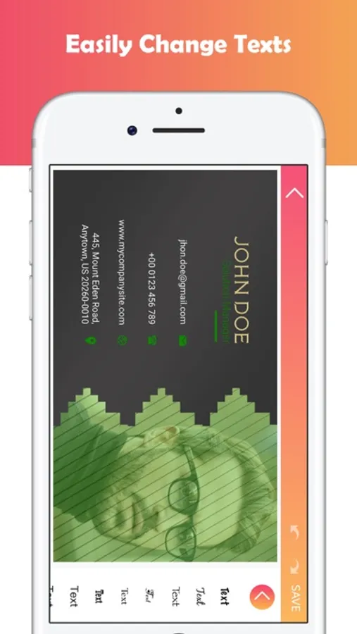- Insert texts like your name, company name, mobile number, email address, website, etc...