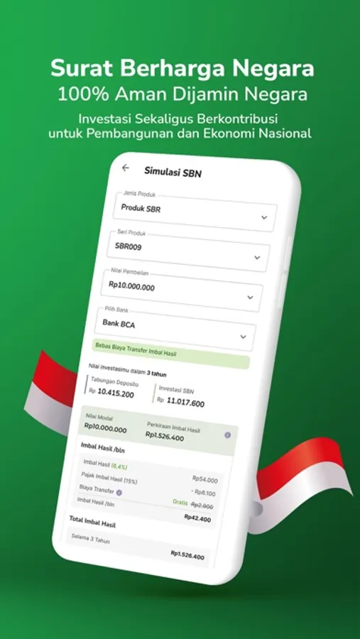 100% aman dijamin negara serta turut berkontribusi untuk pembangunan dan ekonomi nasional. Imbal hasil langsung dikirim ke rekeningmu setiap bulan sampai jatuh tempo.