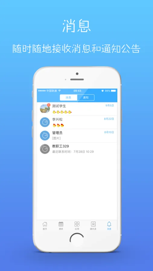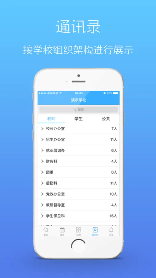 通讯录按学校组织架构进行展示,方便按部门和班级分组进行浏览;