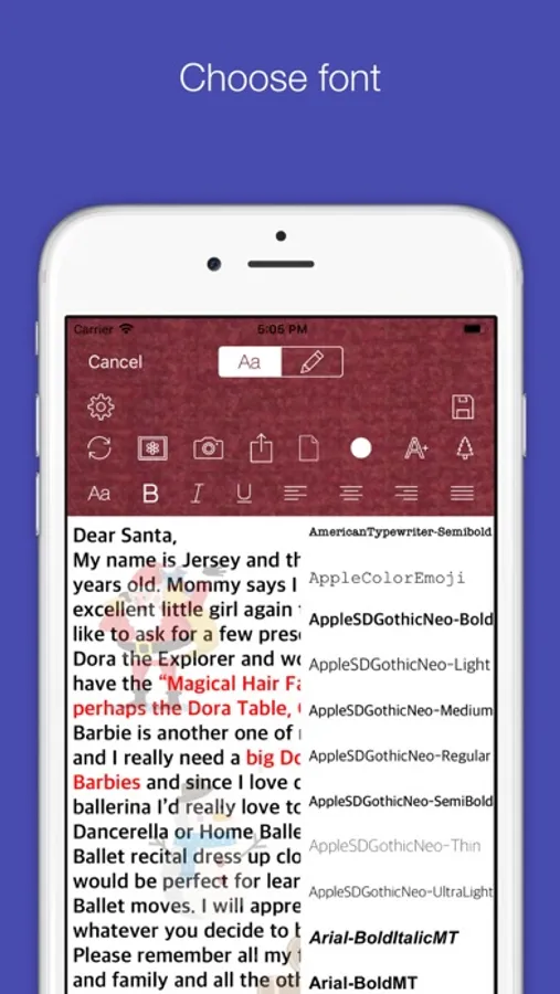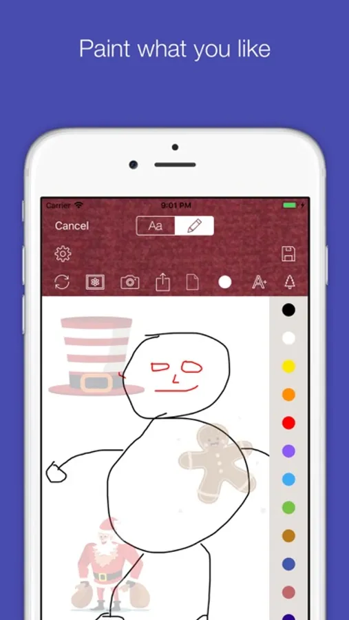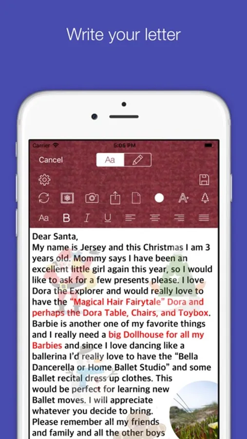 With a simple and intuitive interface, divided into text and drawing sections, you can add typical Christmas images as a background and also choose photos from your library or take them with the camera without overlapping the letter text.