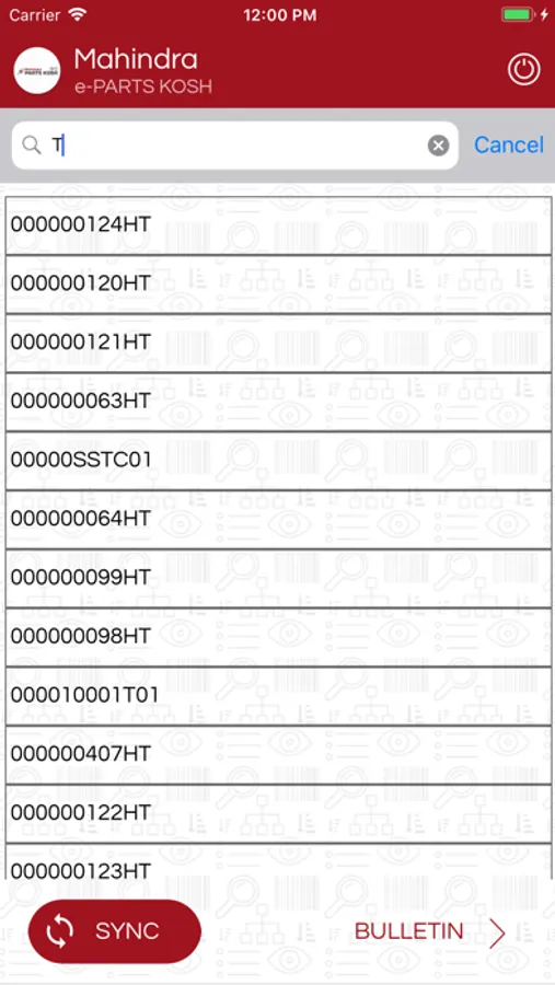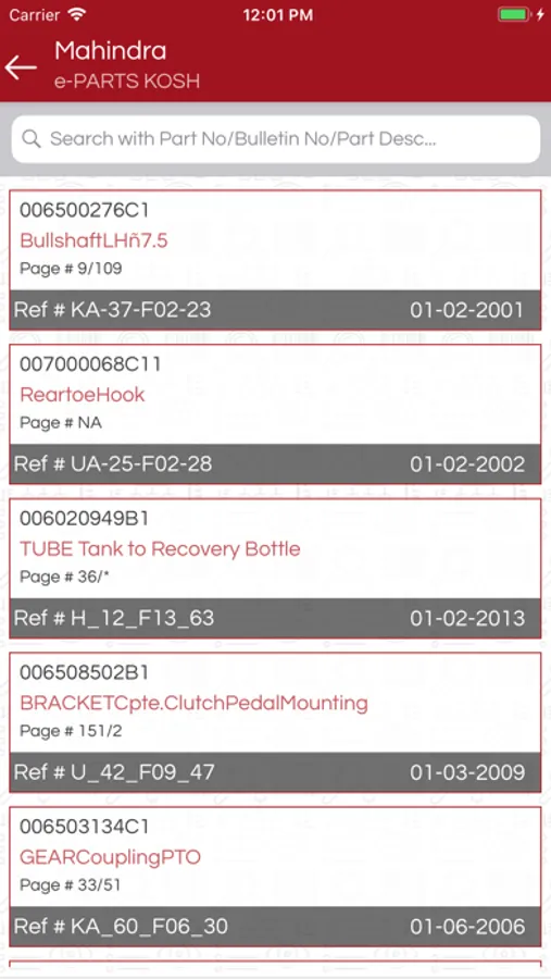 3. Parts Search List can have part based on provided search query along with displaced history. User can tab on any part and redirected to respective bulletin PDF.