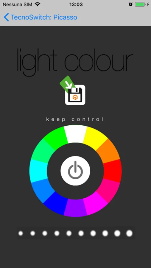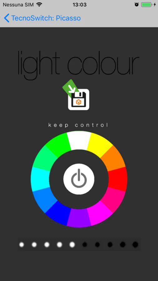 L'unica icona consente di salvare l'ultimo colore selezionato. In caso di assenza di rete, al ritorno, la lampada Picasso si illuminerà con l'ultimo colore salvato.