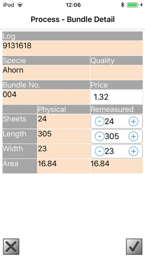 This app is for the retail sales of veneer from the warehouse. Add logs or bundles by scan or manual input. With the ability to amend the sales price, measure back the bundles and print a document directly from the App.