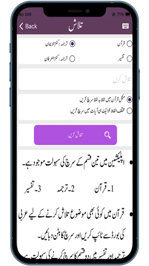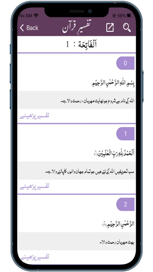 2) Interpretation: Apart from translations app has also a Tafseer (Interpretation) i.e. Siraat-ul-Jinan.