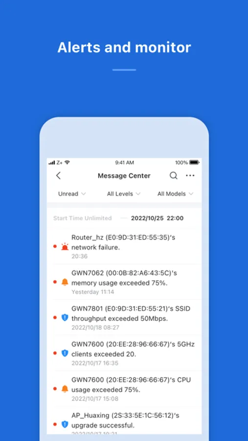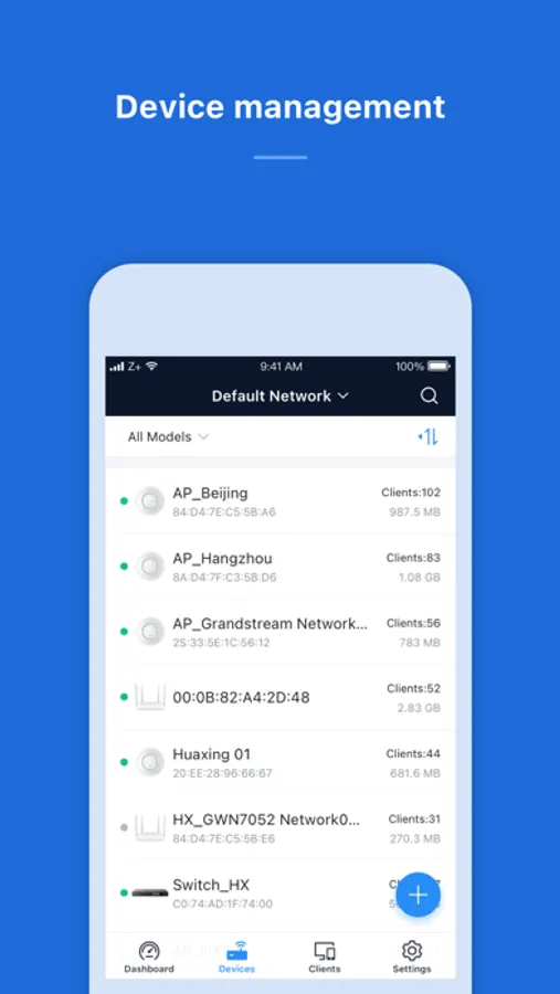 Manage the network-based devices at anytime from anywhere using iOS phone with the GWN app. This free app links seamlessly with devices registered in GWN.Cloud or GWN Manager, and allows users to conveniently monitor and manage the network established by GWN devices. The GWN app extends web features to iOS phone to allow you to manage the network and be productive while on-the-go: monitor network/device/client status in different time periods, notify alert information once alert event occurs, add device to the network via phone camera scanning or manually fill in device MAC and its corresponding password, monitor device details including usage and other information, support debug tools for problem-tracking, configure your network as well as devices according to your needs, and much more. There is no purchase necessary to manage the network-based devices with the GWN app.