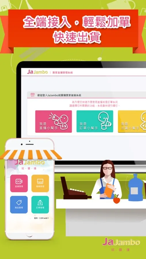 FB / Line / IG 直播最多直播台的唯一選擇,立即使用就醬播Ja Jambo 小幫手,加入FB / Line / IG 直播銷售的行列,讓你輕鬆打開零售新渠道,掌握新商機。
