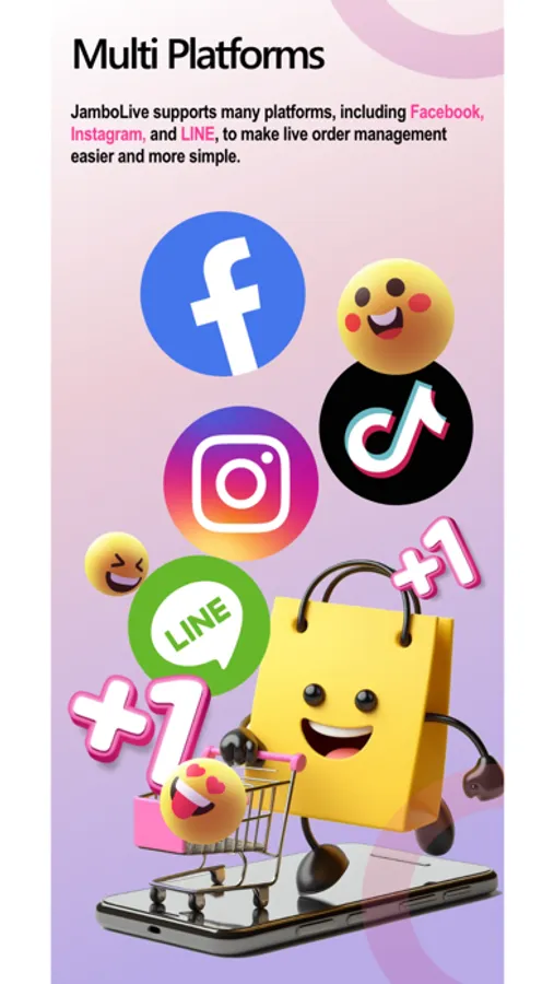 不要猶豫了,立即下載Ja Jambo就醬播,與其讓您的商品淹沒在讓你在Yahoo拍賣,蝦皮拍賣,PCHome,露天拍賣,MoMo購物,Firdays的商品海中,不如馬上在Facebook / Line / IG 中展開直播銷售,在最多人使用的社群媒體裡,輕鬆擁有比一般商城還高的導購成功率!坐擁FB / Line / IG的廣大社群人潮,創造最大的新零售商機!