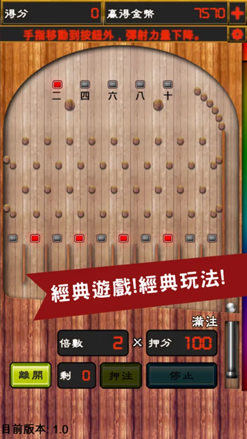 經典夜市彈珠台玩法,利用技巧讓彈珠如您所願的打入對應的洞,將會依照該局的倍率給予對應獎勵!簡單又輕鬆的夜市機台遊戲,是不是又再度挑起您的興趣了!不需網路,打開即玩,隨時可以用手機玩上一兩局,消磨時間的好夥伴。