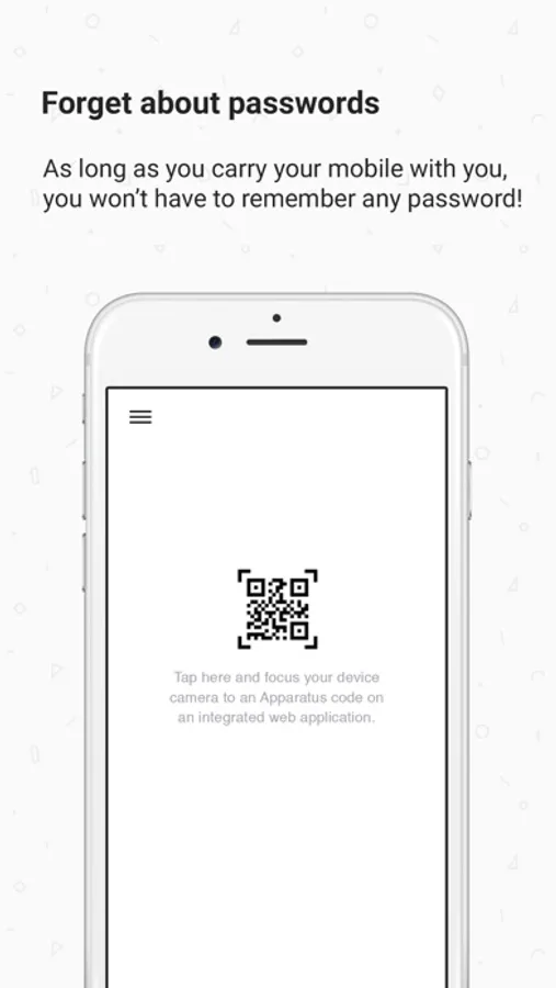 A passwordless secure way to log in and register in applications that they are integrated with apparatus app. You don't have to remember credentials anymore, you have everything on your smartphone that you have with you all the time, and no security issues because they have nothing to steal from you!