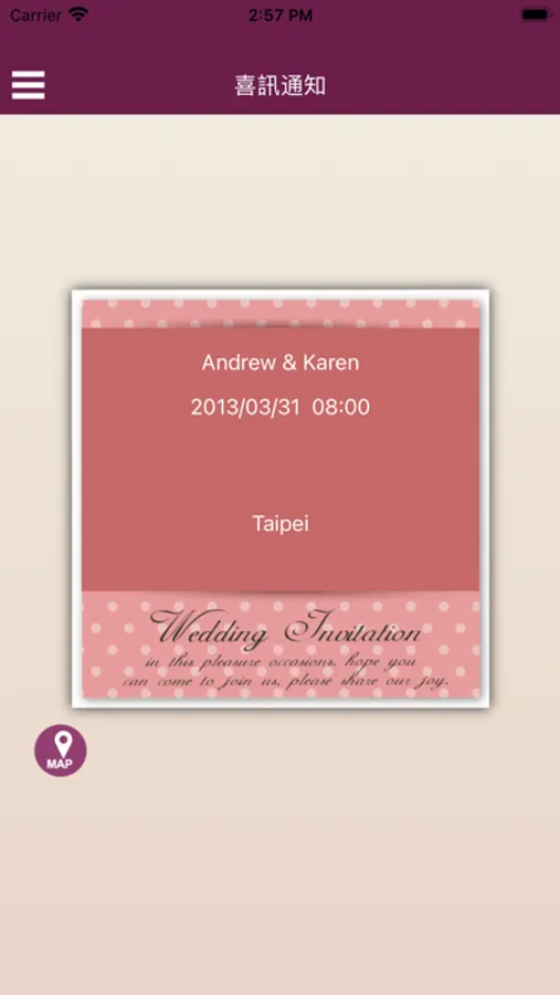 ◆喜訊通知功能: 知道結婚的時間和地點,並提供map路徑規劃到婚宴現場的功能, 不會再找不到路