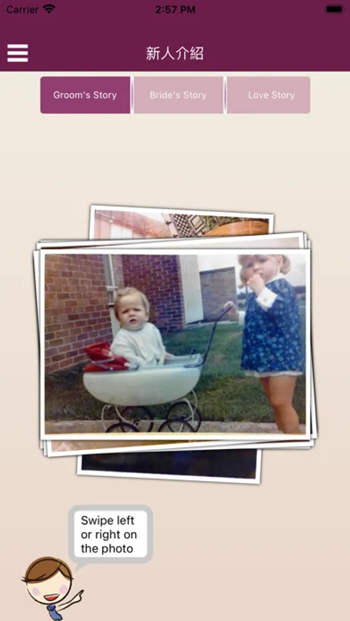 ◆新人介紹功能: 了解關於新郎的成長歷程. 新娘的成長歷程以及兩人相遇的過程, 以照片和文字的方式提供瀏覽