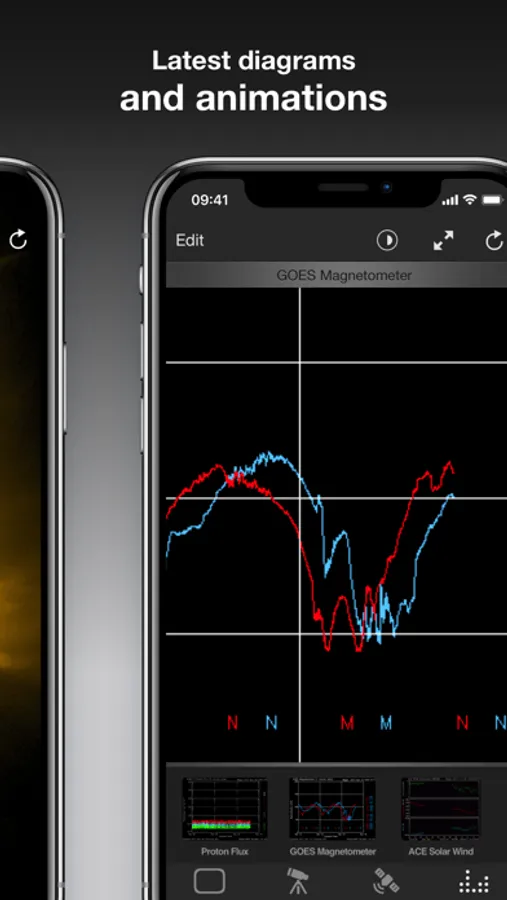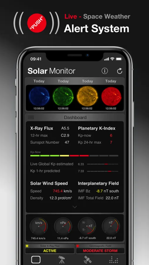 At a glance you acquire the current solar and geomagnetic activity. High resolution images of the Sun are taking your breath away. The Sun is being displayed in near real-time. Minute-by-minute updates of solar wind speed, density, sunspot number are provided. Diagrams and animations make Solar Monitor a professional tool, pushing the latest space weather alerts directly to your device.