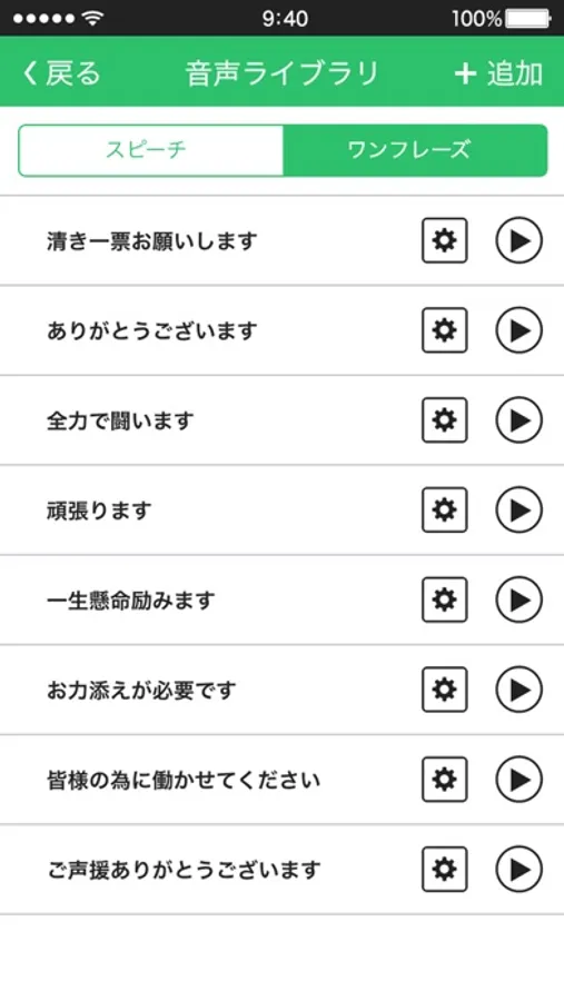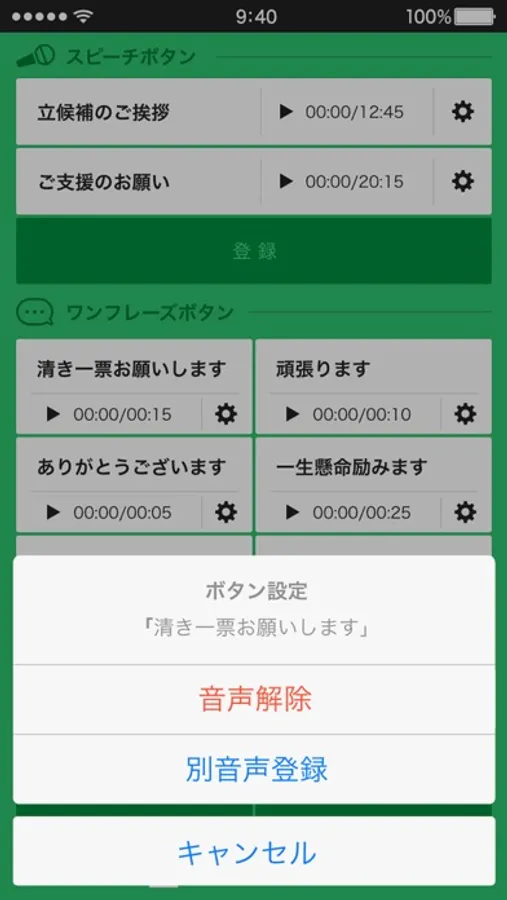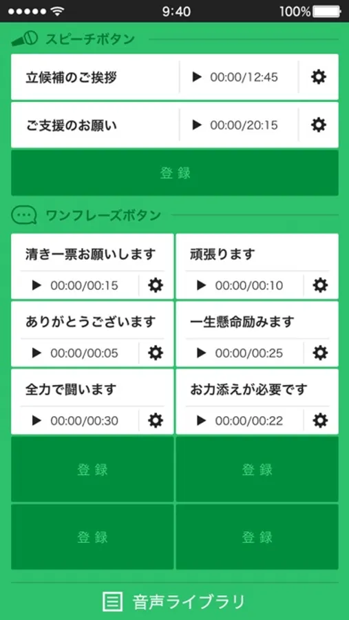 最長30分のスピーチを録音&再生可能なスピーチボタンを3個用意し、支援者様にお応えできるワンフレーズボタンを10個用意しました。