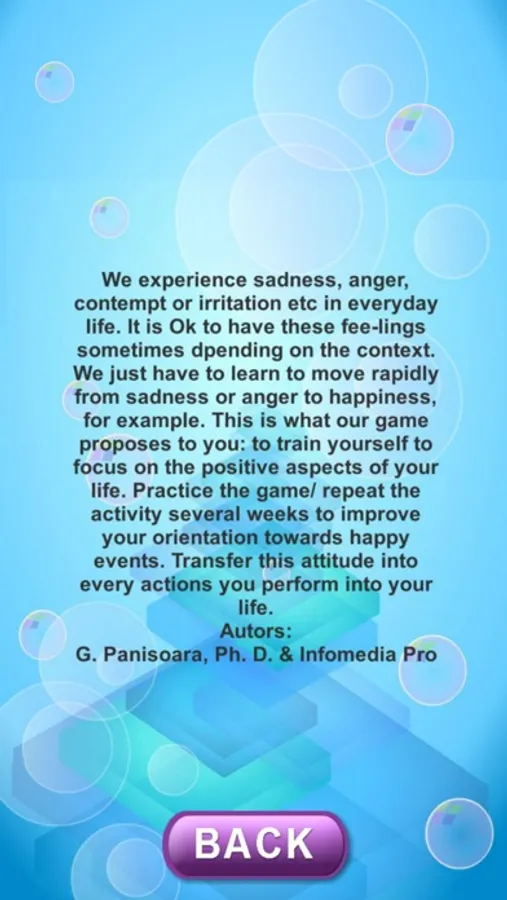We experience sadness, anger, contempt or irritation etc. in everyday life. It is Ok to have these feelings sometimes depending on the context. We just have to learn to move more rapidly from sadness or anger to happiness, for example. This is what our game proposes to you: to train yourself to focus on the positive aspects of your life. Major depression is a common mental disorder affecting adolescents in the entire world according to statistical data. We have to practice to be more happiness-oriented. We have to practice to be oriented towards positive life. Let's enjoy precious moments in our life!