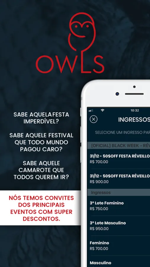 Quem assina o Owls tem acesso a eventos com descontos fora do normal. Ótimo para quem está sempre presente nas melhores festas, o Owls oferece um portfólio de eventos selecionados.