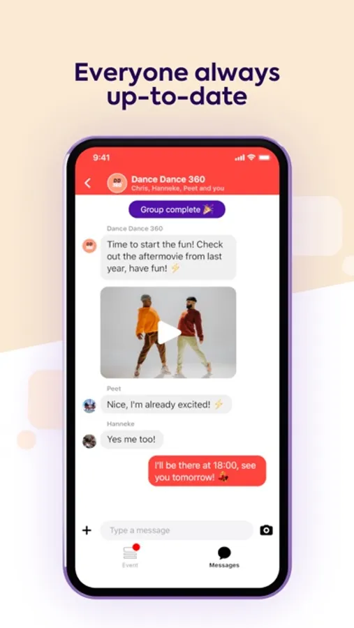 What time do you have to be there? Where to park? Which measures apply? No stress! The app contains all relevant event information in a clear overview. Everyone in the group will receive updates and helpful reminders.