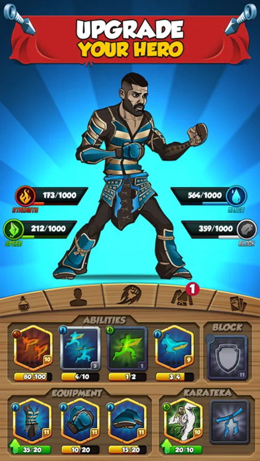 There is a large amount of equipment which boosts your performances. Unlock chests and win awesome prizes. Collect epic element gloves as well as hybrid legendary Karate Gis. Decide will your warrior be unbeatable by using rare spinning kicks or powerful direct punches. It is limited by your desire to be the best. So, how truly you want it?