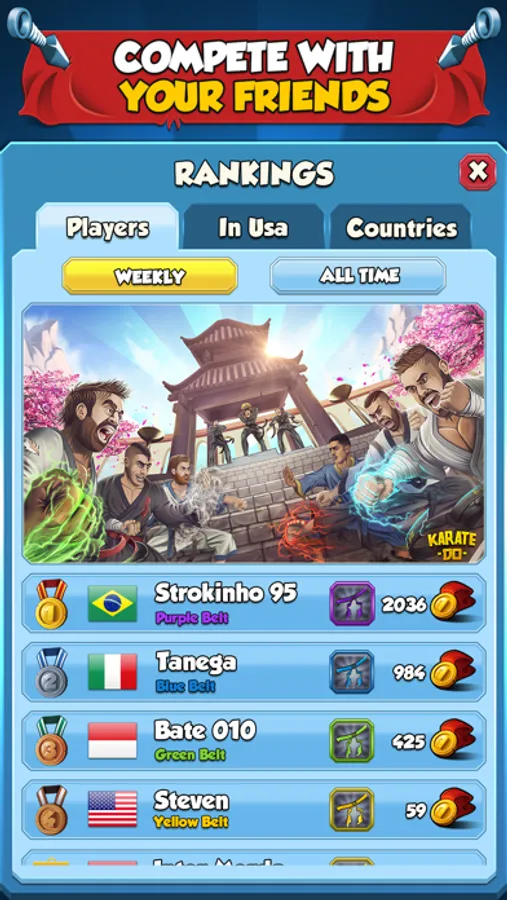 The noble Karate league is gathered in the Dojo. Choose from over 20 Karate legends. Vanquish your opponents by learning new kicks and punches, as well as upgrading them to the stunning levels.