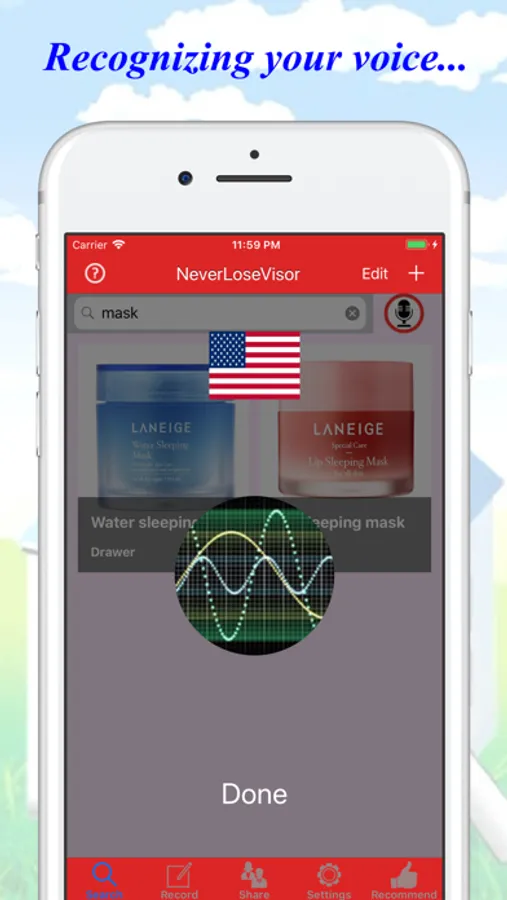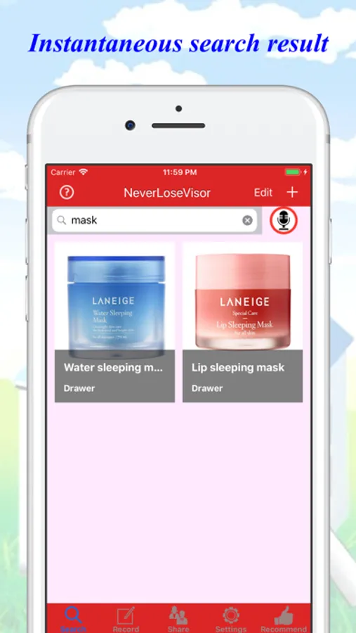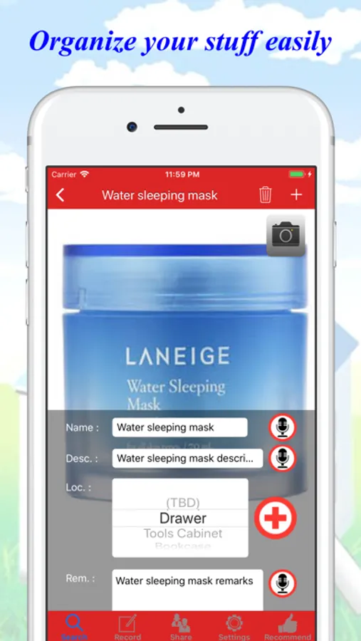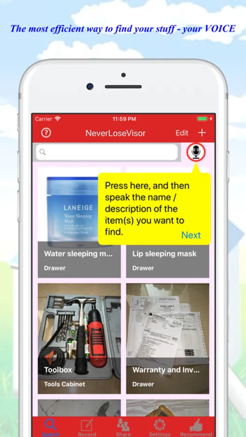 It allows you to take inventory and find your things by VOICE. Simply keep details by: