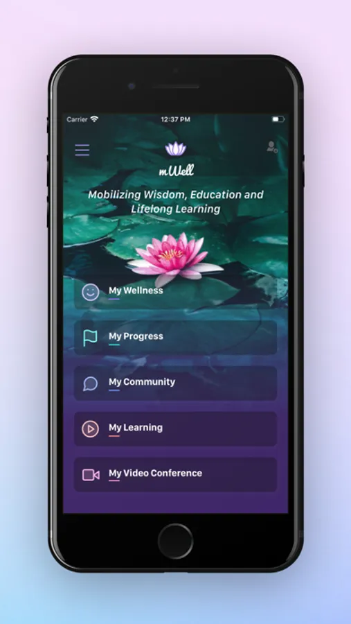 mWELL is designed to supplement individuals' well-being by providing users with a one-stop platform where they can access videos and materials on self-care practices, as well as capture data to track progress on their efforts to promote their own well-being. The app also has capabilities for journaling and connecting with others as a learning community.