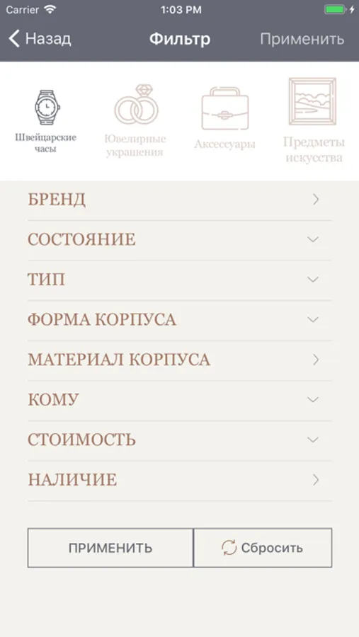 В нашем обширном каталоге предложены швейцарские часы, ювелирная продукция и аксессуары от многих именитых брендов. Для ценителей искусства у нас найдутся редкие картины известных русских и зарубежных мастеров.